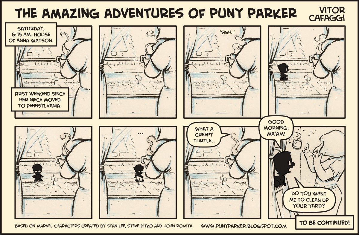 - Lembra de uma garotinha ruiva que costumava aparecer por aqui? Uma que foi embora no final da segunda temporada? Semana que vem, esteja de volta para conferir a tirinha número 100 de Puny Parker! Uma tirinha colorida.